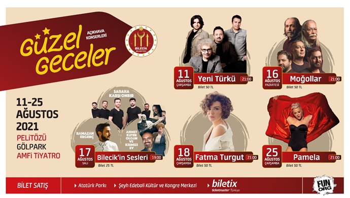 “Güzel Geceler” sloganıyla 11 Ağustos Çarşamba günü Yeni Türkü ile başlayacak konserler, 16 Ağustos Pazartesi günü Moğollar, 17 Ağustos Salı günü Bilecik’in Sesleri,18 Ağustos Çarşamba günü Fatma Turgut ve 25 Ağustos Çarşamba günü Pamela konseri ile son bulacak.