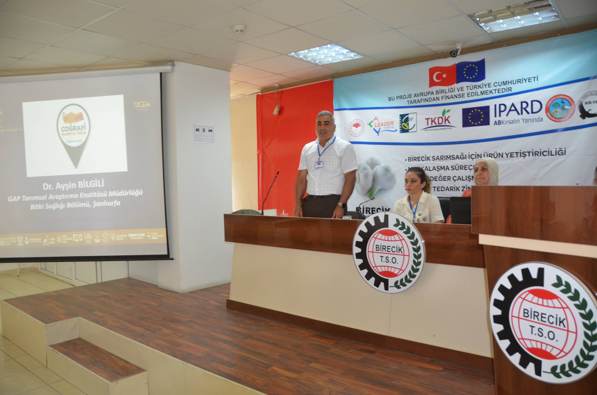 Birecik Sarımsağı Coğrafi İşaret Başvuru Sürecinde Görev Alan Personeller Dr. Ayşin Bilgili, Zir. Yük. İsmail Rastgeldi ve Dr. Şehnaz Korkmaz Birecik Sarımsağı Coğrafi İşaret Başvuru Sürecinde Birecik sarımsağının tescil çalışmaları için birer konuşma yaptılar.