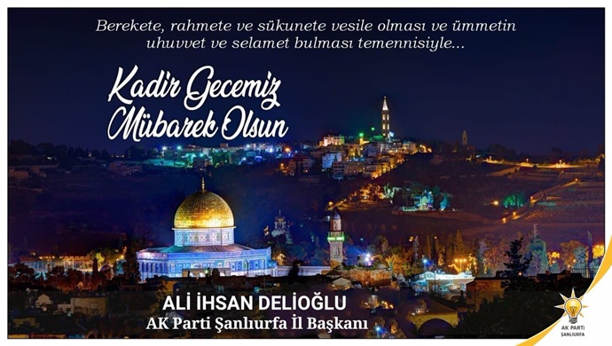 Devamını oku »AK Parti Şanlıurfa İl Başkanı Ali İhsan Delioğlu’ndan Kadir Gecesi Mesajı AK Parti Şanlıurfa İl Başkanı Ali İhsan Delioğlu, Kadir Gecesi için tebrik mesajı yayınladı. AK Parti Şanlıurfa İl Başkanı Ali İhsan Delioğlu Kadir Gecesi için yayınladığı mesajda, ” Kadir Gecesi günahlardan arınma üzerimizdeki sıkıntılardan belalardan, musibetlerden kurtulma gecesidir. Yüce …