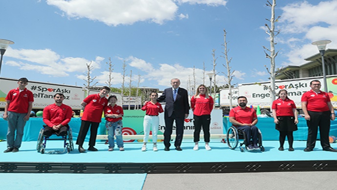 “Spor Aşkı Engel Tanımaz” diyerek Millî Eğitim Bakanlığına bağlı 81 ilde 500 özel eğitim okuluna farklı engel gruplarının kullanımına sunmak üzere üretilen 27 bin 259 adet spor malzemesinin yola çıkacağını söyleyen Cumhurbaşkanı Erdoğan, içinde spor malzemelerinin olduğu tırları hep beraber ülkenin dört bir köşesine uğurlayacaklarını vurguladı.